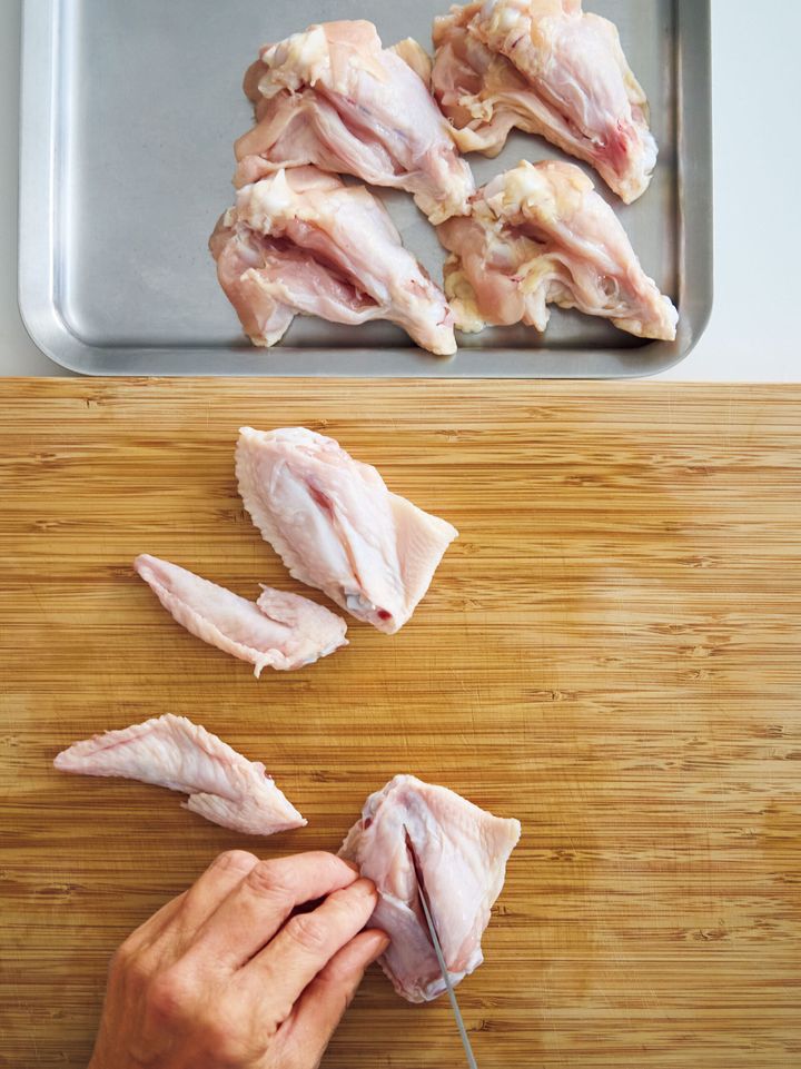 (1)じゃがいもは皮をむいて縦3等分に切り、さっと洗う。手羽元は骨にそって1本切り込みを入れる。手羽先は先の細い部分を切り分け、太い部分は骨にそって1本切り込みを入れる。