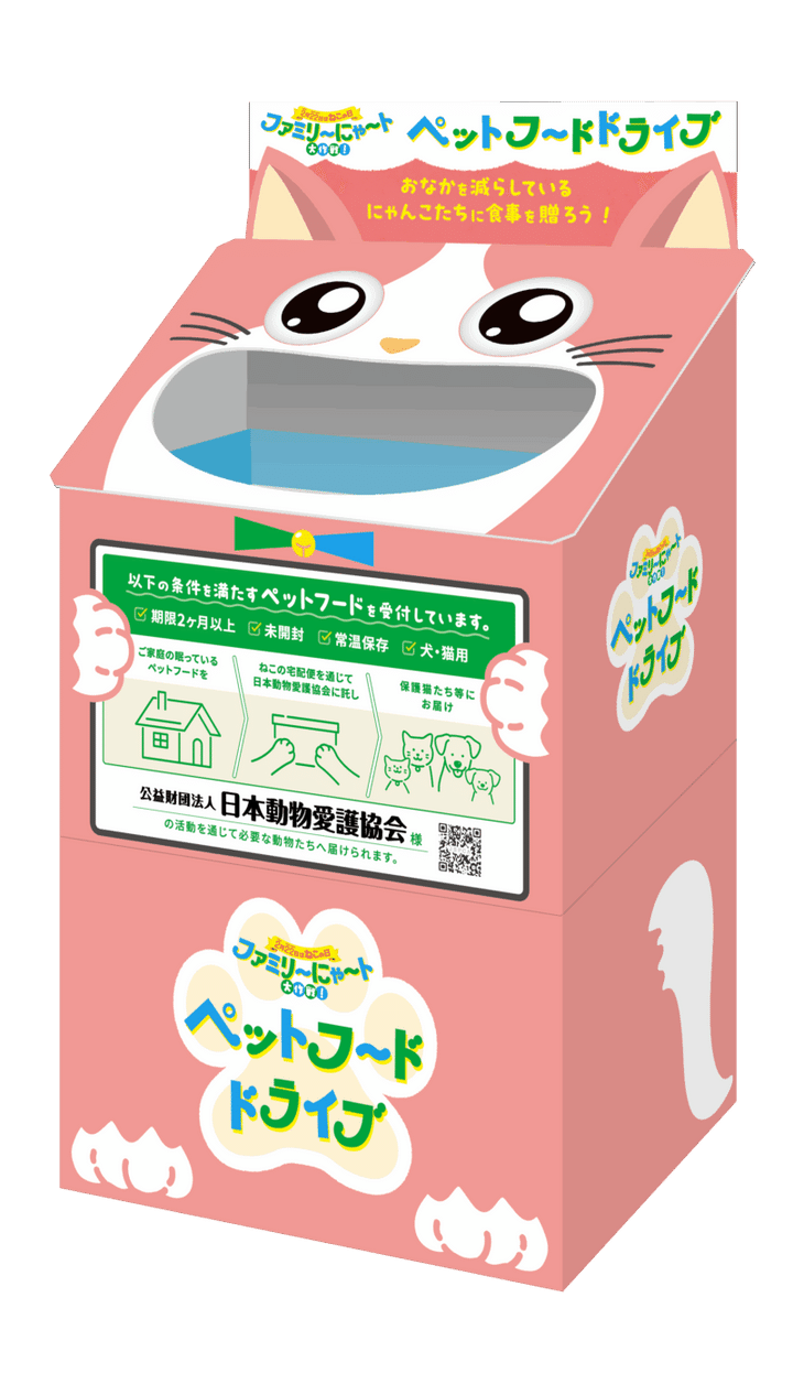地域猫(保護猫)活動の支援強化を行っているファミリーマート。昨年2月22日のねこの日に合わせて「ペットフードドライブ」を設置し、約3000食分のごはんを回収したことでも反響を呼びました。そこで今年は設置店舗数を2倍に拡大! ご家庭に眠っている未開封のペットフードをファミリーマート店舗に持ち込むと保護猫などの食事支援につながります。