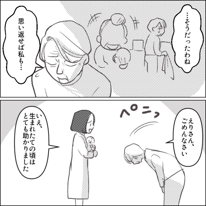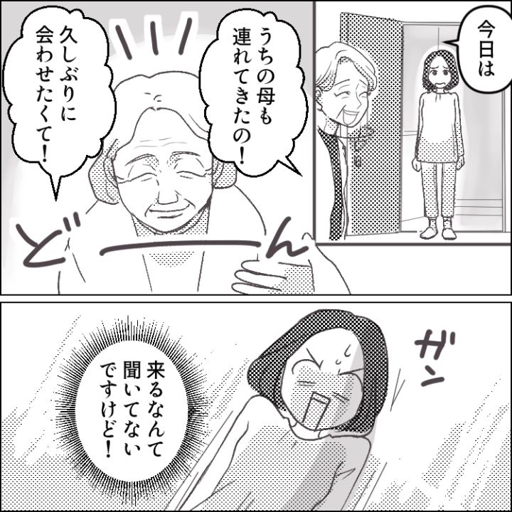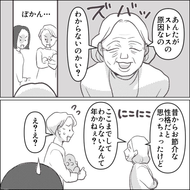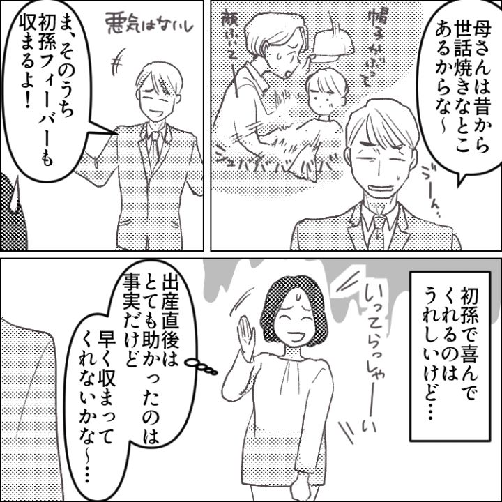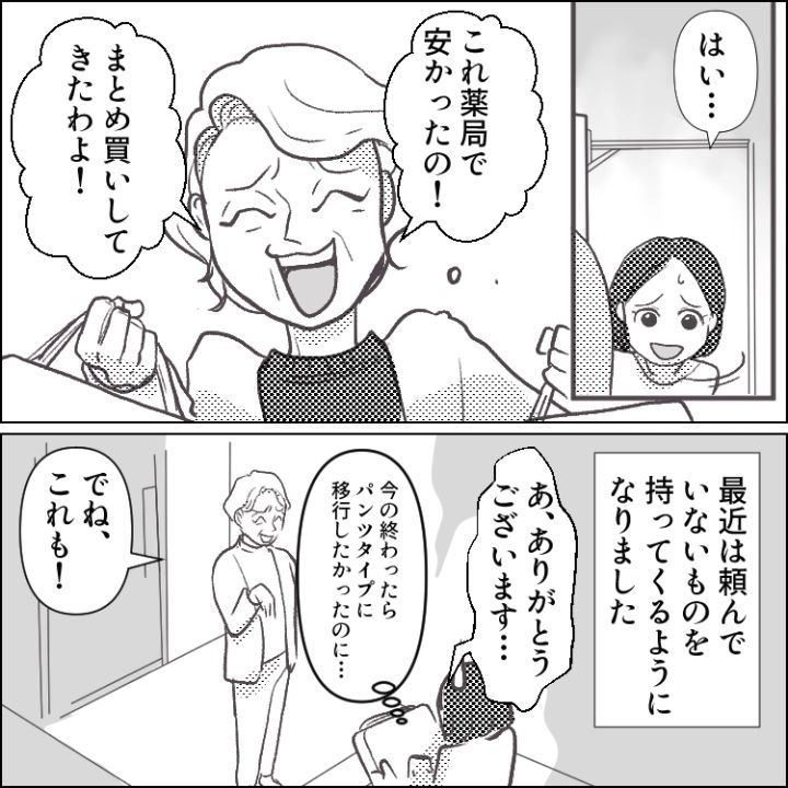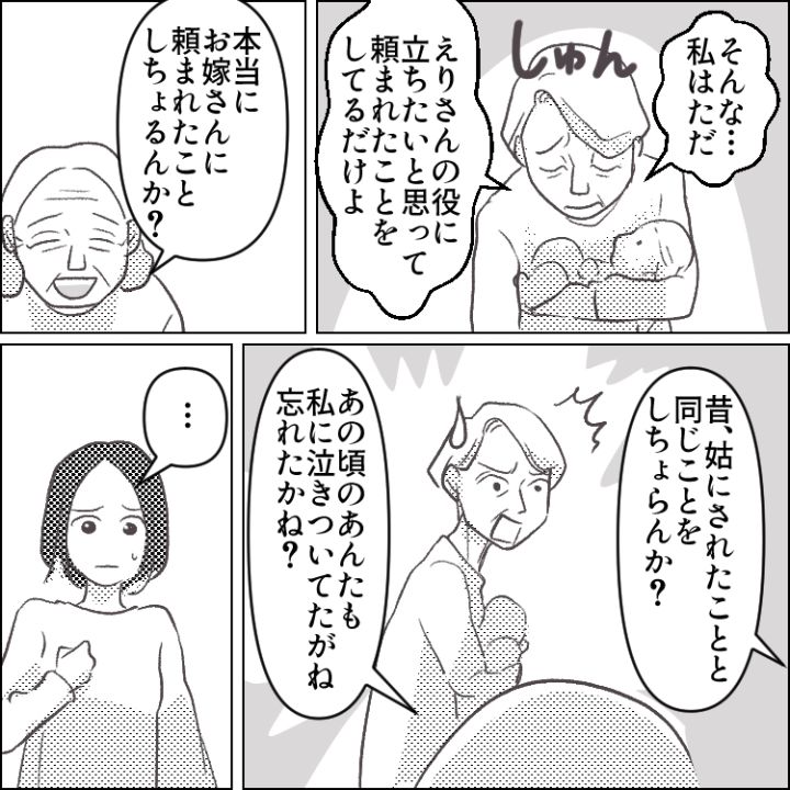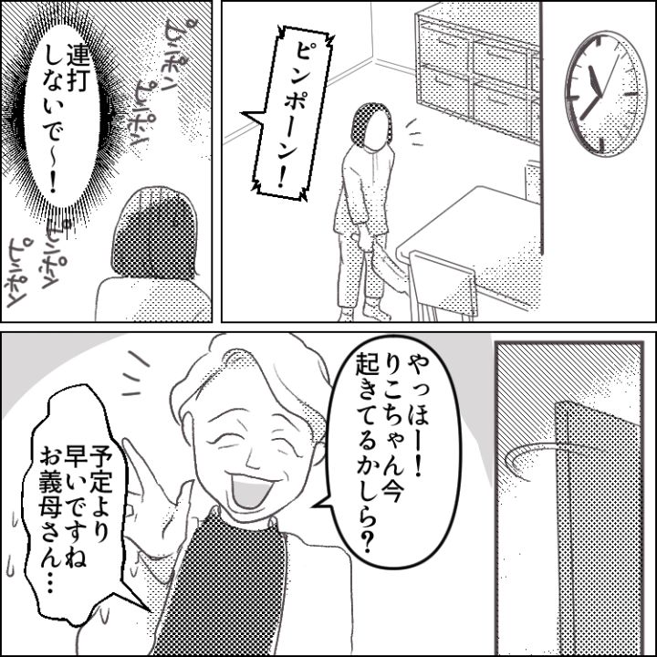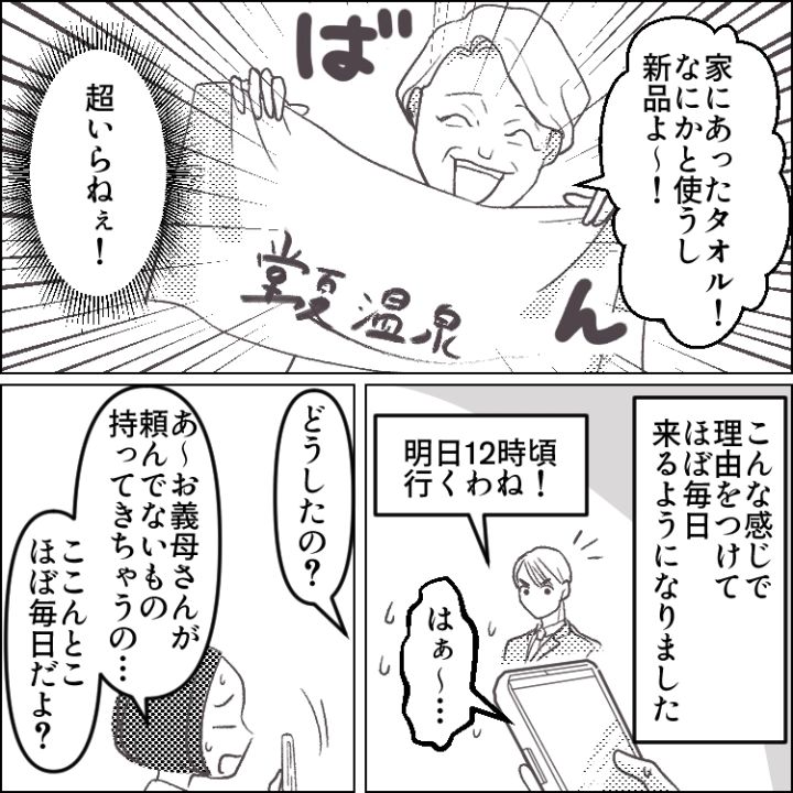 えりは半年前に娘のりこを出産したばかり。里帰り出産はしなかったため、産後は何かと義母が気にかけてくれ、買い物も担当してくれたたため、非常に助かっていた。しかし、最初はえりが頼んだものだけ買ってきてくれたものの、次第に頼んでないものまで押し付けてくるようになり、さらにはほぼ毎日のように家にやってくるように。エスカレートしていく義母に対して何か言ってくれないかと夫に頼むが、夫はすぐに収まるでしょと、気にしていない様子。モヤモヤを抱えたまま過ごしていると、いつものように義母がやってくる。ところが、なんと今回は勝手に義祖母まで連れてくる事態に!?