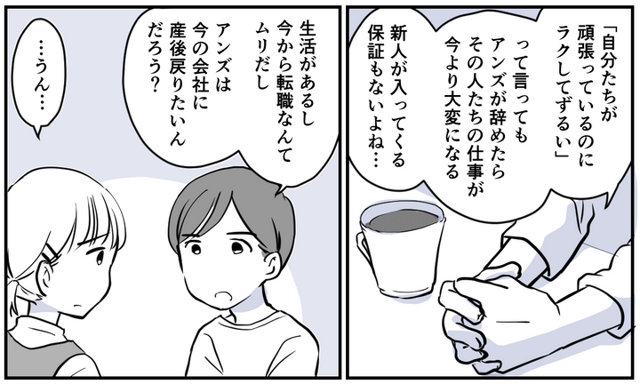 私たちの生活のことを考えれば、今から新しい仕事を探すのは現実的ではありません。また、私自身が今の職場環境を気に入っており、産休後も戻りたいと考えていることも夫は理解してくれていました。