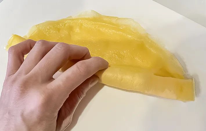 卵をクルクルと巻き、端から力を入れすぎないように包丁を動かして細く切っていきます。
