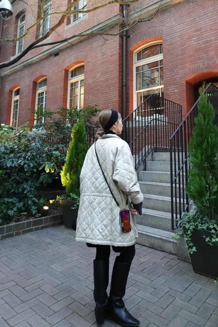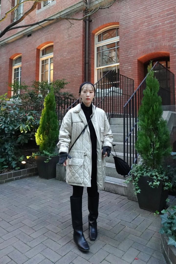 「絶妙な色味と光沢のキルティングコートは、高円寺の古着屋doma bldgで買ったもの。独自のセレクトが揃う名店なので、ディグるのが楽しいんです(笑)。中はユニクロのタートルニットと古着のショートパンツを合わせて。黒のタートルは、シンプルで使いやすいので重宝しています。足元はロングブーツで少し重くなるので、ヘアバンドや大ぶりピアスで視線をアップしました」(MARTE/saharaブランドマネージャー、SYKIA デザイナー三好香織さん)