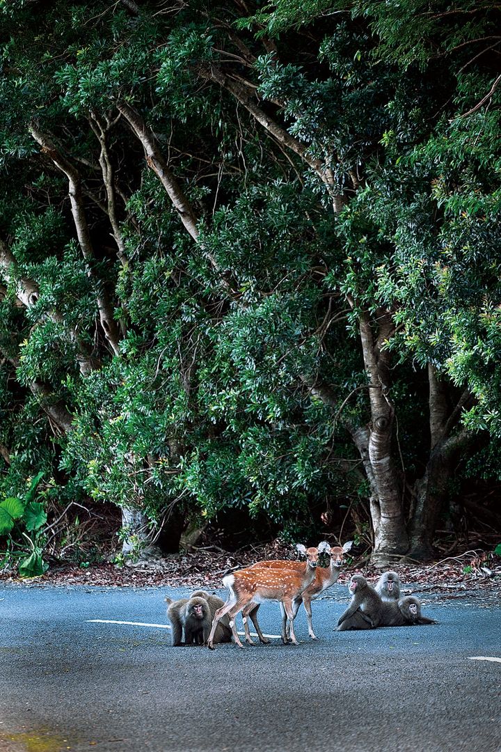屋久島が世界自然遺産に登録されたポイントの一つが、西部林道が通る海岸線から山頂部までに凝縮された、植物の生態系。島の西側を覆う照葉樹は野生動物の王国となっており、とりわけシカとサルの共存は世界でも珍しいとされ、時には背中にヤクシマザルを乗せて移動するヤクシカのほほ笑ましい姿が、林道からでも見られるほど。ただし、ヤクシマザルが人間に対して狂暴化する原因となる「餌付け」は条例で厳しく禁止されています。