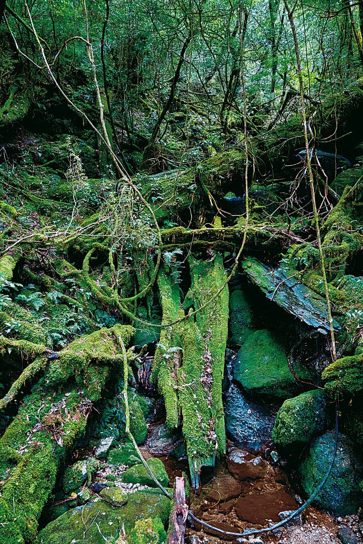 江戸時代に伐採後に放置された倒木や台風で倒れた屋久杉は土埋木(どまいぼく)と呼ばれ工芸品などに加工されます。原生林はコケの生息にも最適の環境。緑のコケが優しく木肌を覆います。 HIROSHI ABE