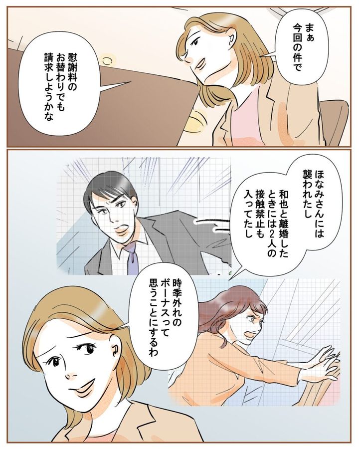 佐藤さんが心配してくれるのは有難いけど、やっぱり迷惑はかけられません。私はなんともない顔をして「まぁ、今回の件で慰謝料のおかわりでも請求しようかな。ほなみさんには襲われたし、和也と離婚したときには2人の接触禁止も入ってたし、時季外れのボーナスって思うことにするわ」と言いました。