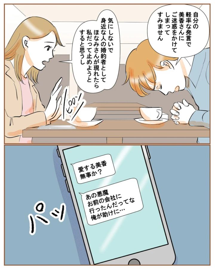 「自分の軽率な発言で、美香さんにご迷惑をかけてしまってすみません」頭を下げて謝る佐藤さんに、「気にしないで。身近な人の婚約者としてほなみさんが現れたら、私だって止めようとすると思うし」そう話していると、和也からまた「愛する美香、無事か?あの悪魔、お前の会社に行ったんだってな。俺が助けに・・」というメッセージが届きます。