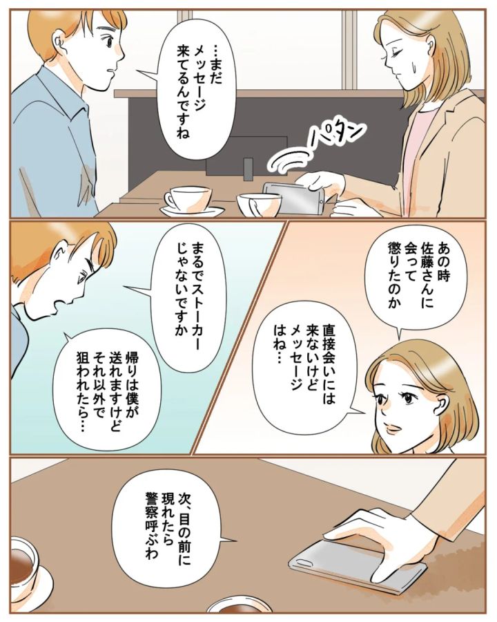 パタンとスマホを裏返す私に、「・・まだメッセージ来てるんですね」と言う佐藤さん。「あの時、佐藤さんに会って懲りたのか、直接会いには来ないけどメッセージはね・・」そう呟くと、「まるでストーカーじゃないですか。帰りは僕が送れますけど、それ以外で狙われたら・・」と心配してくれる彼に、私は「次、目の前に現れたら警察呼ぶわ」と伝えます。