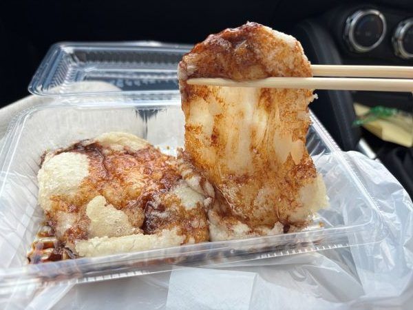外は揚げたてサクサクで、箸で持ち上げるとびよーんと伸びる柔らかいお餅でした。