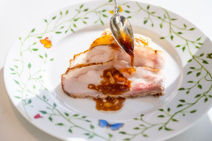 メイン料理「ビゴール豚ロースの低温3時間ロースト“スペシャリテ” 軽やかなジュと共に ドフィノワポテトとグリュイエールチーズのグラタン」。