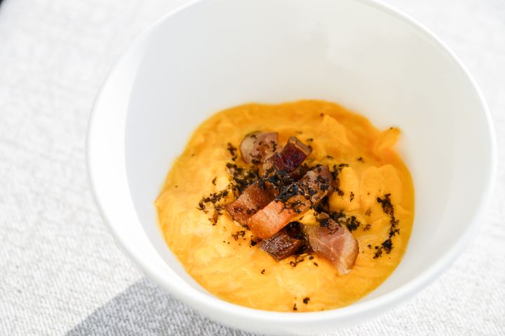 卵料理は、とろっとろに仕上げたスクランブルエッグ。トリュフのほかにクリスピーなベーコンもちらして、旨みもたっぷりです。