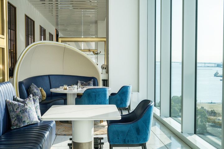 高い天井のラウンジからはみなとみらいを一望。シンパンケーキはほかに、定番の「ザ・カハラ・クラシック・シンパンケーキ」や昨年誕生したしょっぱい味の「チーズメルト・シンパンケーキ」も。ぜひ特別な時間を過ごしてください。