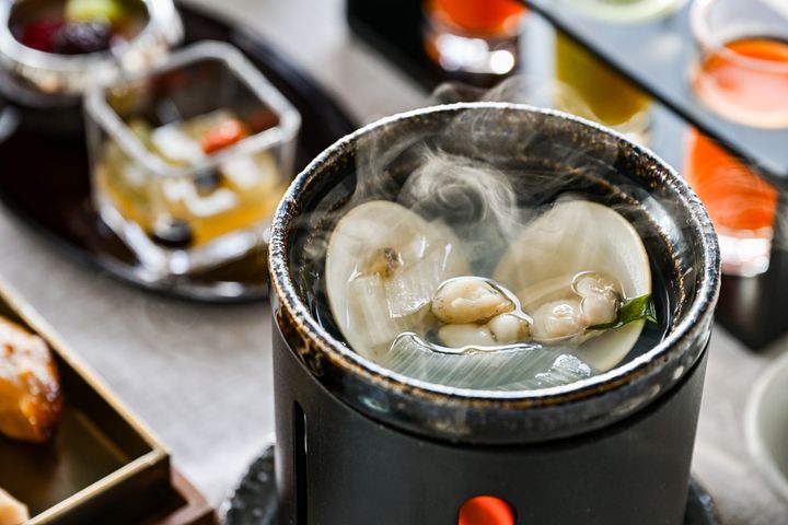 小鍋で湯気を立てているのは「貝出汁の鍋 鮑 蛤(はまぐり) 神奈川県産若芽」。小鍋がいっぱいになるほど大きな蛤から出汁が最高の出ており、この汁をごはんにかけるのもおすすめです。