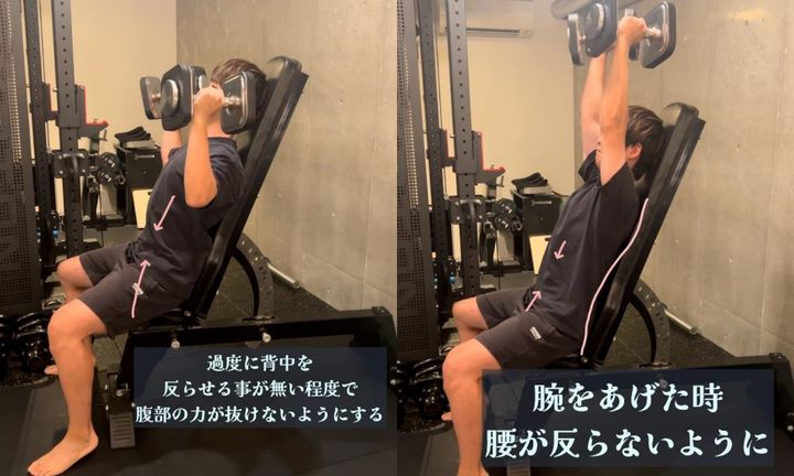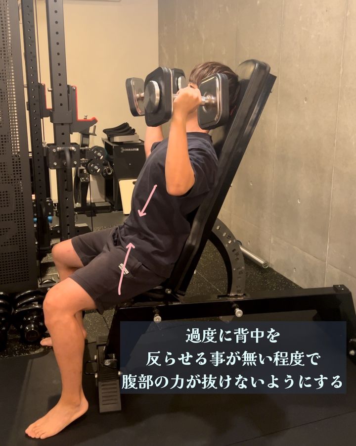 ダンベルを両手に持ち、ベンチに座ります。足を床にしっかりとつけて、安定した姿勢を取ります。背中はベンチにしっかりと押し付け、腹部を引き締めてコアを安定させます。