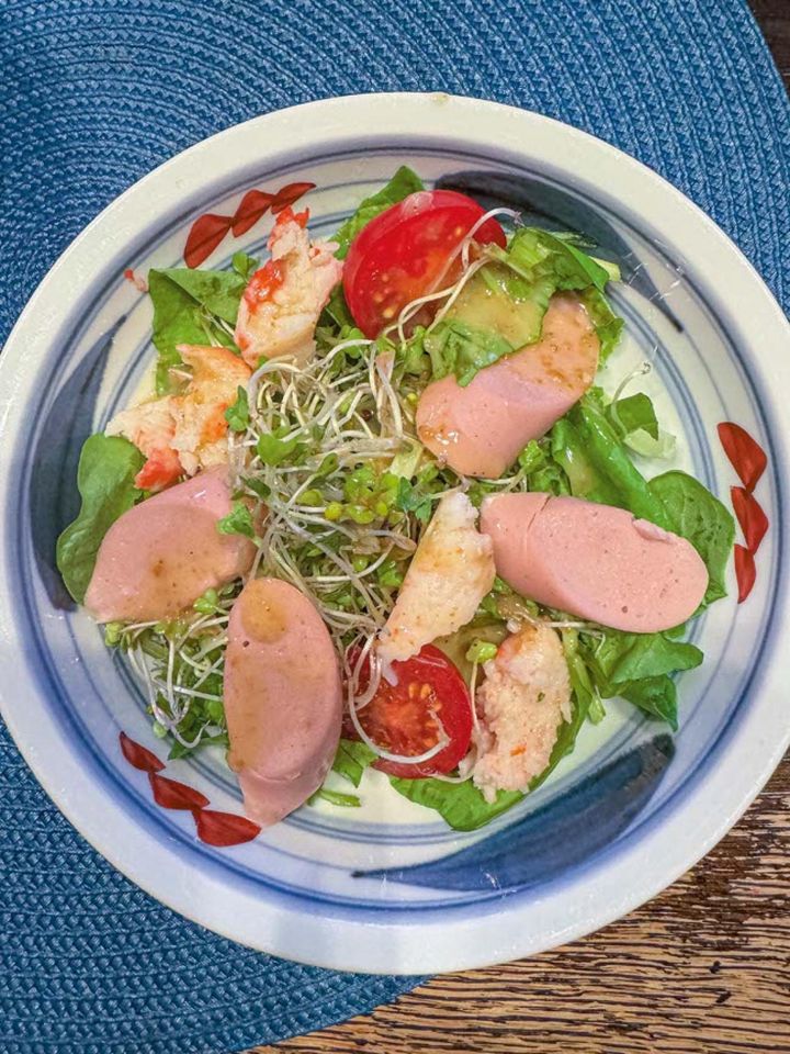 鎌田さんがおすすめする朝のサラダ。魚肉ソーセージでたんぱく質をプラス。