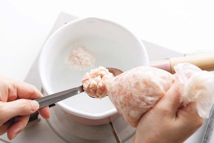 ❹ポリ袋の角を切り、肉だねをスプーンですくって、沸騰した湯に入れる。