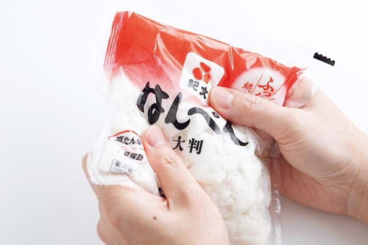 ❶はんぺん1枚は開封する前に袋の上から少し形が残っているくらいまでつぶす。