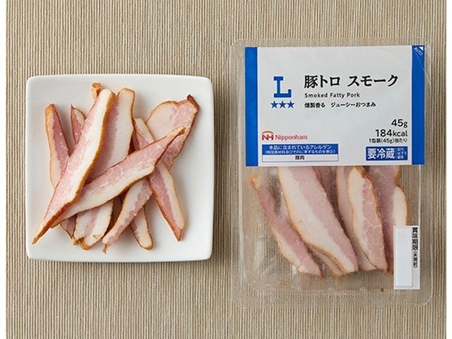 燻製が香る、ジューシーな豚トロをスライスしました。