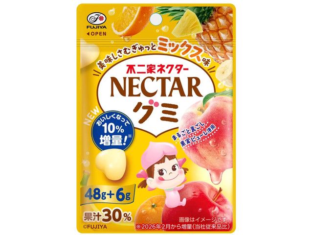 ・内容量を10%増量し、より果汁感を感じられる味わいに ・飲料「ネクターミックス」と同じ5種の果実の果汁が30%入ったジューシーな味わい ・可愛い「ももぺこ」のパッケージと可愛いもも型のグミで見た目も愉しめる