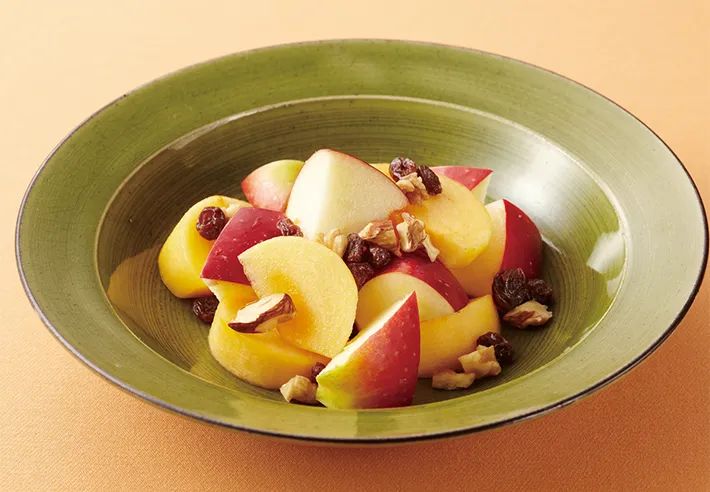 ナッツやレーズンの食感がアクセントになったユニークなサラダ漬けです。塩が柿やリンゴの酸化を防ぎ、甘みを際立たせます。