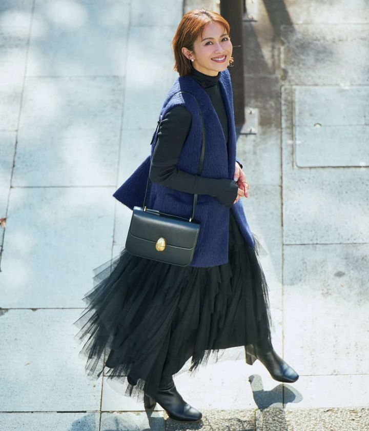 5位 華やか黒チュールスカートに【ネイビージレ】を合わせて大人の落ち着きを