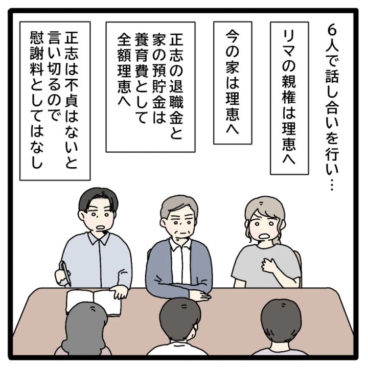 その後も6人で話し合いを続けました。私からは、リマの親権と今の家、そして正志の退職金と家の預貯金も養育費として全額私が受け取ること、正志が不貞はないと言い切るので慰謝料は請求しないという条件を提示しました。