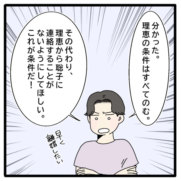 こちら側の条件を聞いた正志は「分かった。理恵の条件はすべてのむ。その代わり、理恵から聡子に連絡することがないようにしてほしい。これが条件だ!」と言いました。正志から提示された条件はこの一つだけ。私が提示した条件は正志に不利なものですが、それをのむ代わりに、私から聡子さんへの連絡は絶対にしてほしくないということなのでしょう。正志はとにかく早く離婚したいようです。