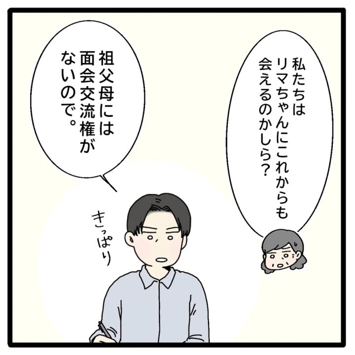 「私たちはリマちゃんにこれからも会えるのかしら?」と義母が心配そうに聞くと、兄が「祖父母には面会交流権がないので」ときっぱり否定。