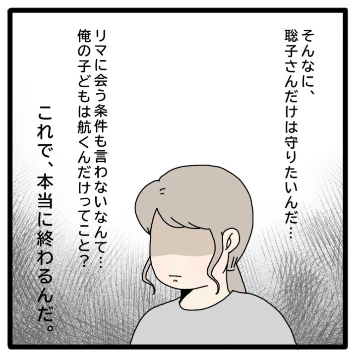 そんなに、聡子さんだけは守りたいんだ・・。リマに会う条件も言わないなんて・・俺の子どもは航くんだけってこと?普通は子どもとの面会頻度とかを言ってくるものなんじゃないの?正志の頭の中は聡子さんと航くんでいっぱいで、もうリマや私のことなどどうでもいいようです。これで、本当に終わるんだ。そう実感しました。