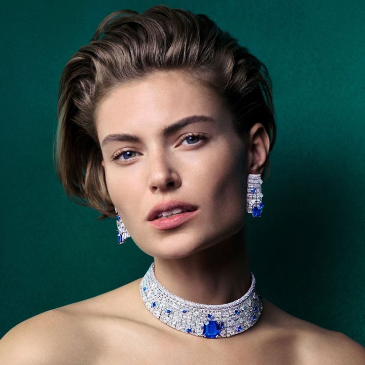 主役となっているのは、31カラットの非加熱 エメラルドカット サファイアがセットされた壮麗なチョーカー。静かな水面に一滴の雫が落ちる瞬間から着想を得ており、175カラットに及ぶ極上のダイヤモンドがシームレスに煌めき、幾何学的なデザインに流れるような動きを生み出します。センターのサファイアを中心にペアシェイプのダイヤモンドとサファイアが煌めきを放つ、躍動感溢れるデザインが特徴です。