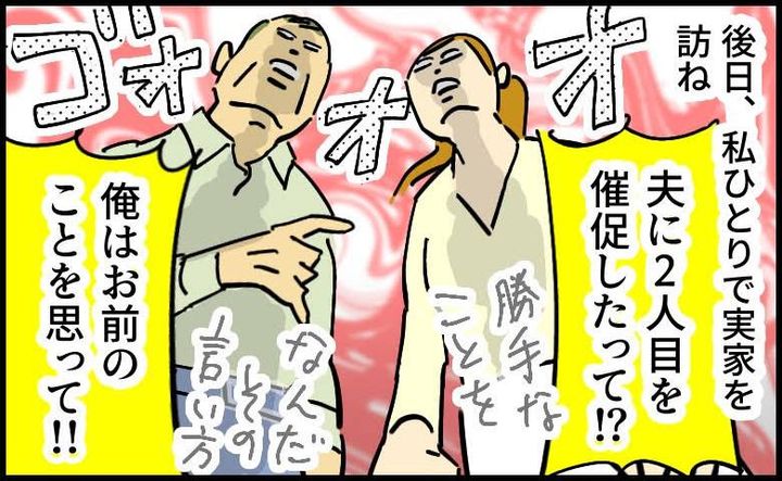 私ひとりが実家に帰って来たので、驚く両親。「いきなりどうしたんだよ」と、父はのんきに尋ねてきます。さらに腹が立ってきた私は、「Aさんに2人目の子どもを催促したって本当!? 勝手なこと言わないでよ!」と感情が爆発。