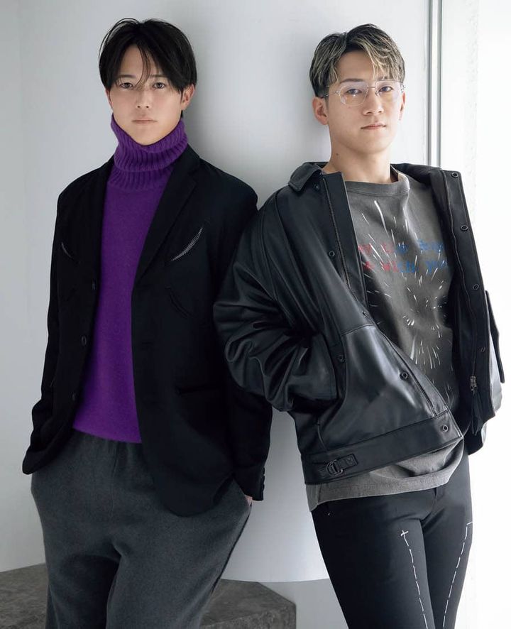 西川龍馬さん:ジャケット¥99,000(CCU)、Tシャツ¥38,500(トーキング アバウト ジ アブストラクション/ブリゲイトデザイン)、パンツ¥60,500(ダイリク)、眼鏡¥52,800(プロジェクトプロダクト/ブリンク外苑前)、森下暢仁さん:ジャケット¥79,310(リトルベッドルーム)、ニット¥68,200(キャッシュアンドバルバ/エグジステンス)、パンツ¥121,000(ラッピンノット/ウメダニット)