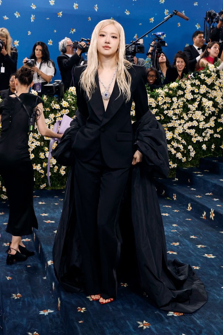 スーツにドレッシーなローブを羽織って、メットガラ 2025のレッドカーペットに登場。胸元で輝くサファイアのペンダントが華やかさを添えて。