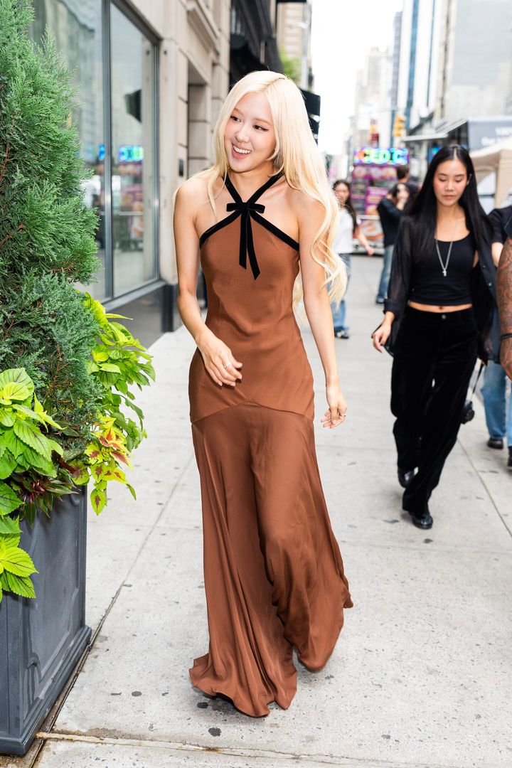 ブラウンのロングドレスで優雅にニューヨークの街を闊歩するロゼをキャッチ。パイピング風にデザインされた黒リボンのホルターネックドレスは、ニューヨーク発ブランド「ロダルテ」の一着。