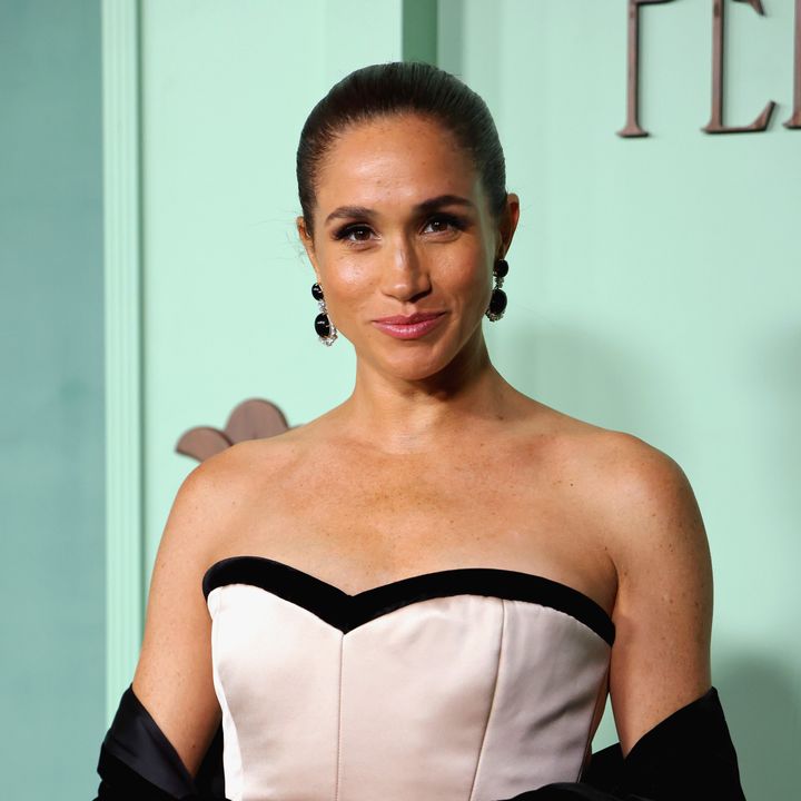 メーガン妃は髪をタイトなアップスタイルにまとめ、ブラックオニキスとダイヤモンドのドロップイヤリングを際立たせた。今回は単独での出席となり、起業家のエマ・グレーデとともにカーペットに姿を見せた。