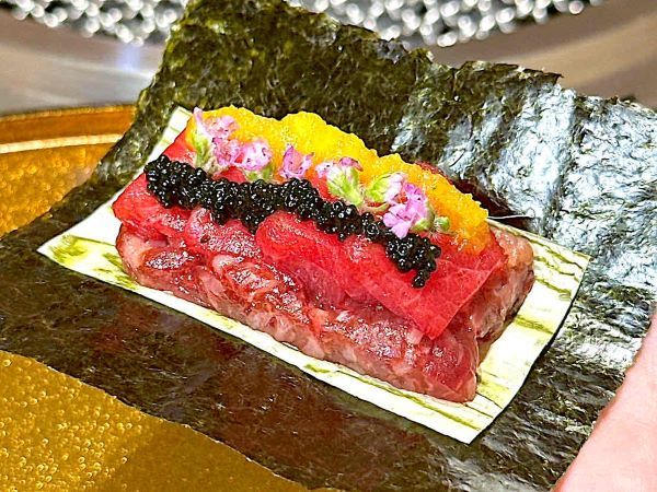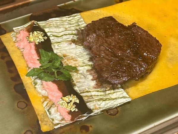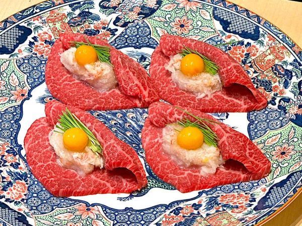 シャトーブリアンでズワイガニを包み込む、まさに贅沢の極み。うずらの卵や蟹身をヒレ肉で包み、焼肉師が目の前でじっくり焼き上げます。中のカニは冷製仕立てで、肉の熱さとカニの冷たさが混ざり合う絶妙な温度差。柔らかさと旨みが一度に押し寄せる、感動のおいしさです。