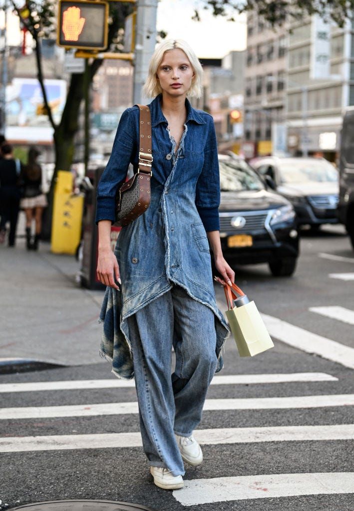 グラデーションにウォッシュ加工されたワンピースを、同色のパンツと合わせてデニムONデニムで着こなして。ユーズド感のあるナイキの「エアフォース1」が、1990年代のグランジムードをより一層盛り上げる。