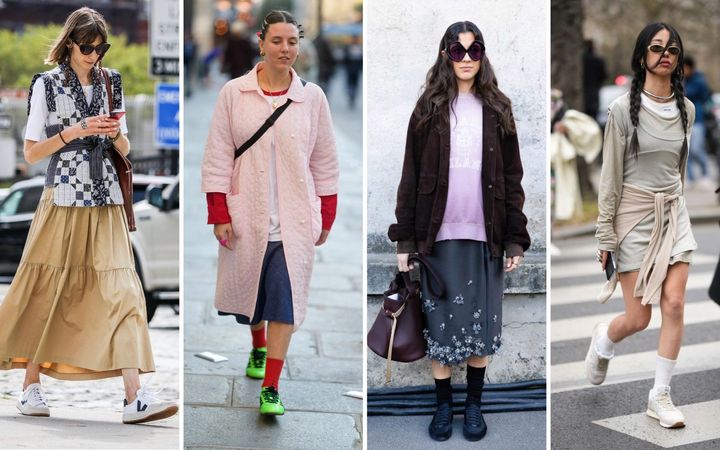 カラーバランスが秀逸なルックは、東京のファッションウィークから。ブルーのニットとコントラストを成すように、タイツとオニツカタイガーの「メキシコ 66 SD」はホワイトで統一。スニーカーにあしらわれたグリッター付きのロゴがささやかなポイントに。