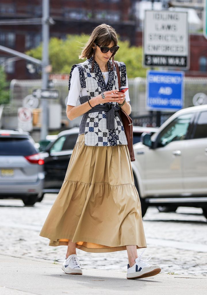 大ぶりのキャットアイサングラスをキーに、キルティングベストやティアードスカートをモードに昇華。ヴェジャのアイコンスニーカー、「V-12」のブランドロゴとベストのネイビーをリンクさせ、全体に統一感をもたらしたのもポイント。