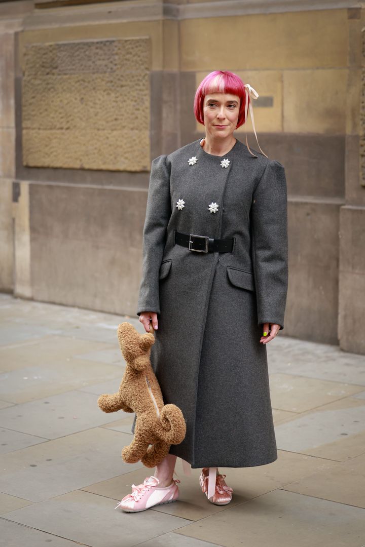 バレエ要素を合体させたスニーカーが人気沸騰中。シモーン ロシャが提案するのは、靴紐にサテンリボンを使った「バレリーナ グリップ トレイナー」。グレーのロングコートを合わせて、甘すぎないバランス感で取り入れて。