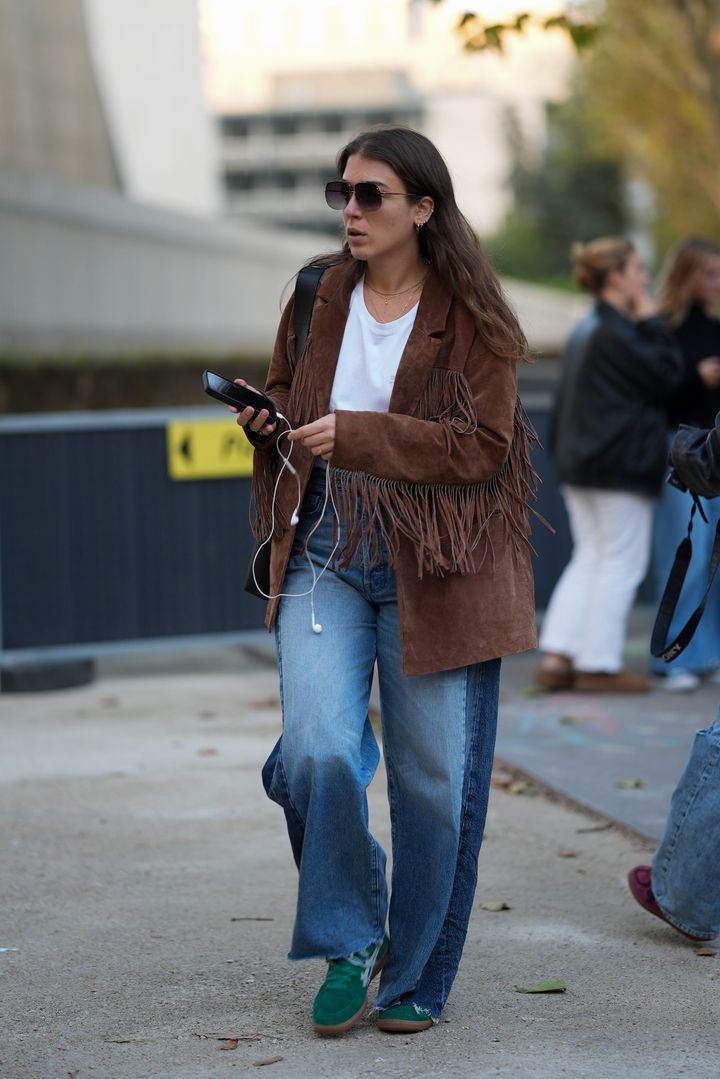 白Txデニムの定番コンビを、フリンジ付きスエードジャケットで華やかにアップデート。スニーカーは、ヘイ(HAY)とアシックスがコラボした「スカイハンド OG」。スエード素材をリンクさせれば、こなれ感がぐっとアップする。