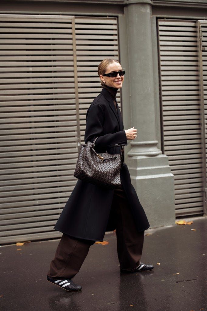 黒コーデには、ブラウン系のアイテムが程よい抜け感をもたらしてくれる。足もとにはアディダスの「テコンドー」をチョイスして、トレンドのロープロファイルスニーカーを抑えた着こなしに。