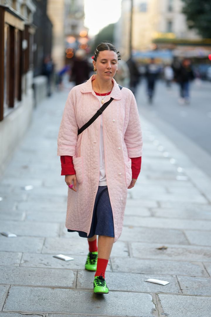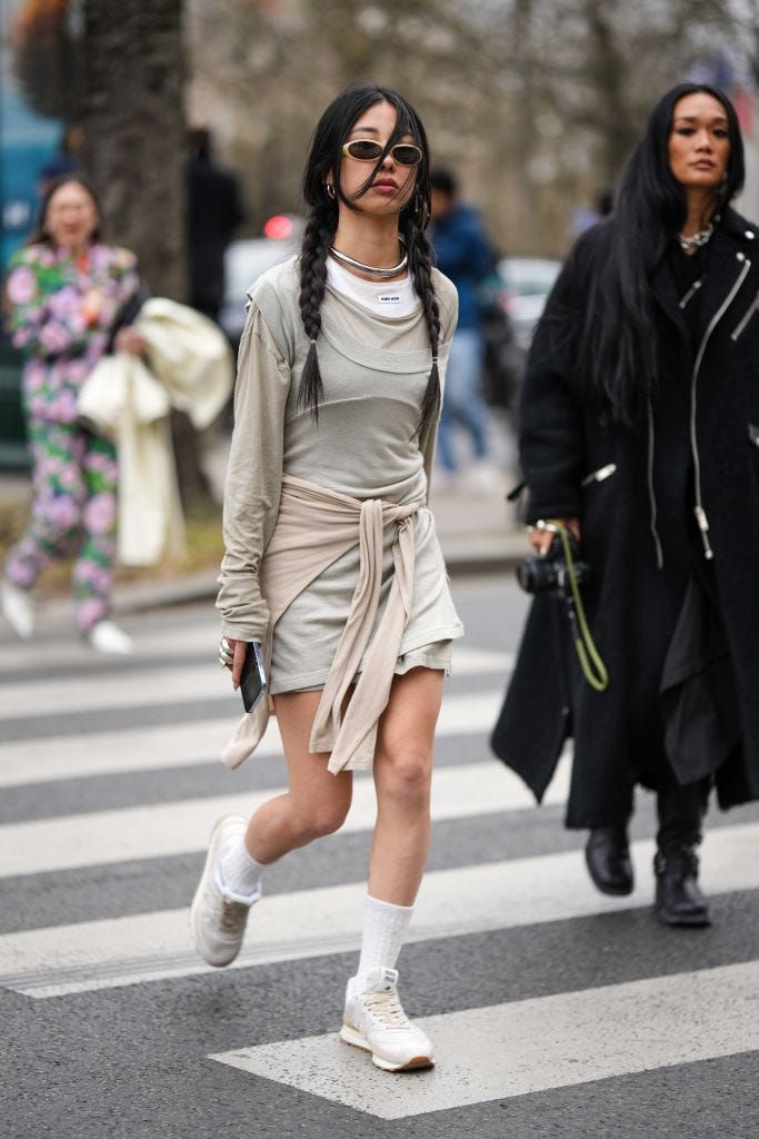 シルエット違いのトップスを巧みにレイヤードしながらも、ダスティな色味でエフォートレスな佇まいに。ニューバランスとミュウミュウのコラボスニーカーは、全身を近似色でまとめて楽しむのが今っぽい。
