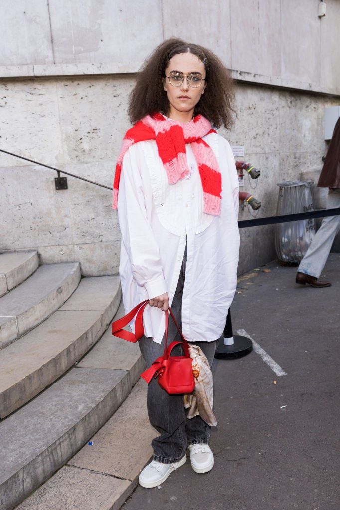 独特の感性で注目を集めるスタイルアイコン、エラ・エムホフ。シャツとデニムというシンプルなスタイリングに、セーターとバッグの差し色で個性を添えた。スニーカーはルイ・ヴィトンの「LV トレイナー・ライン スニーカー」。