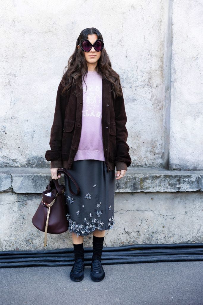 プラダのショー会場周辺でキャッチしたショーのゲストは、全身をプラダのアイテムでスタイリング。スエードとリサイクルナイロン素材を組み合わせた、スリッポン式のスニーカー、「コラプス」を着用し、品の漂うカジュアルスタイルに仕上げた。