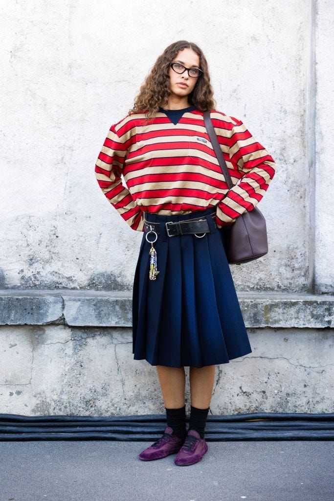 アイウェアとボーダートップスが醸すギークなムードを、プラダのスニーカー「コラプス」のベルベット素材でエレガントにシフト。レザー小物を差し込みモードに仕上げる、高度なスタイリングテクニックを披露した。