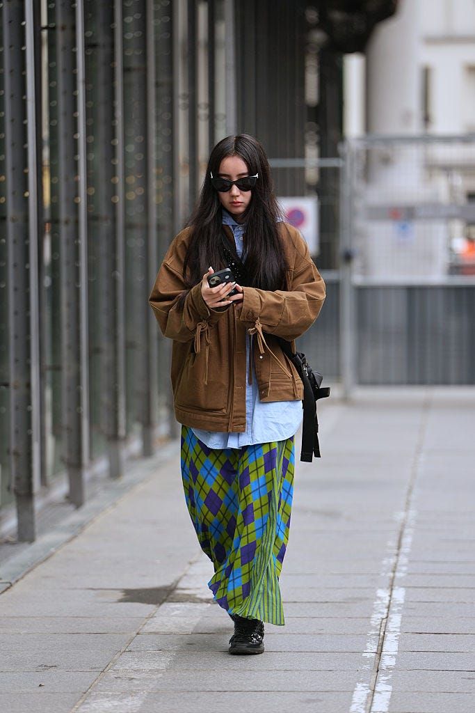 街中で一際目を引くオレンジチェックのコートを主役に、シャツドレスをさらりと合わせ、軽やかに仕上げたルック。サングラスとアディダスの「サンバ」は黒で統一して、コーディネート全体の引き締め役に。