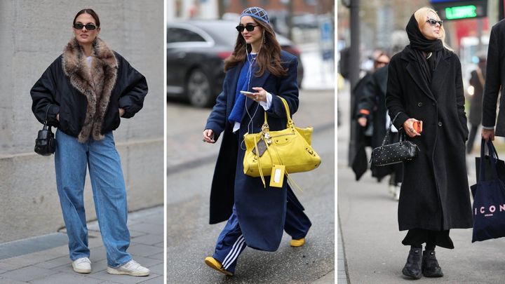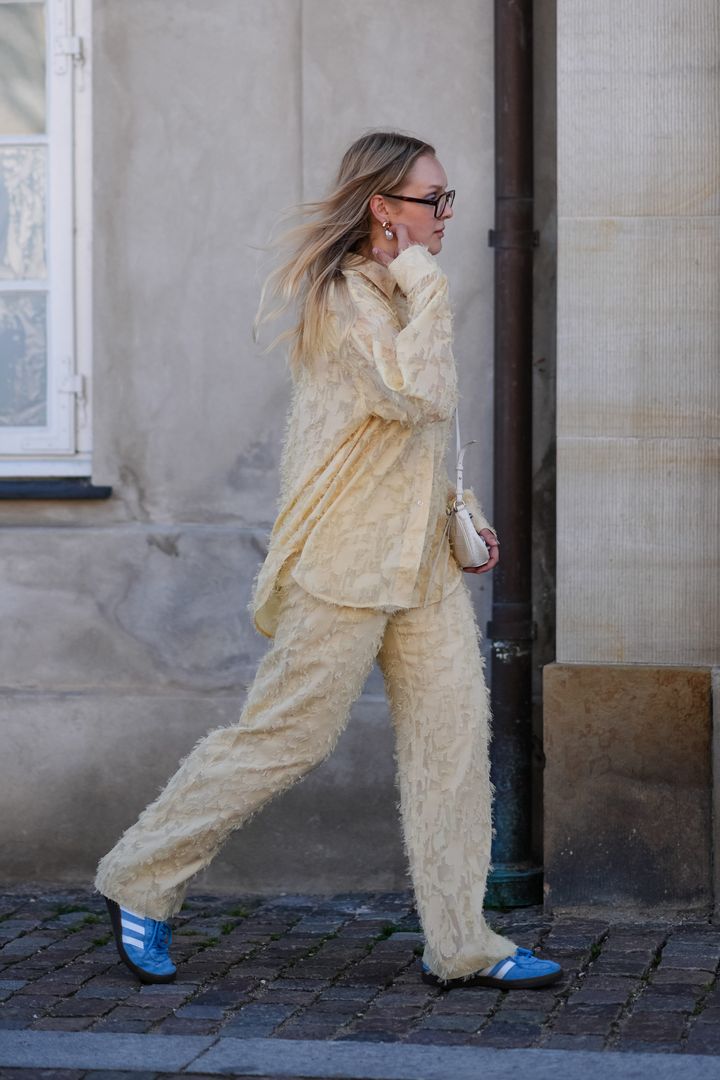 アディダス「サンバ」の鮮やかなブルーは、モードな装いの差し色として重宝。スニーカーに合わせるセットアップを選ぶときは、スニーカーとのコントラストを意識したエレガントな素材感がポイントになりそう。