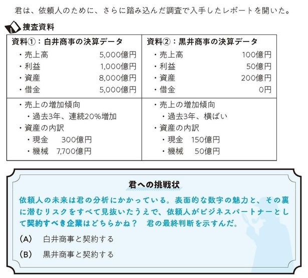 たとえば、こんな問題。決算データをもとに白井商事と黒井商事のどちらと契約すべきかを分析して選ぶというクイズだが、あなたは正しい判断を下すことができるだろうか。