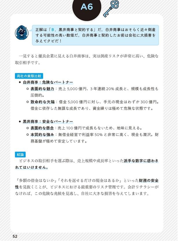 正解は「B.黒井商事と契約する」。一見すると白井商事は優良企業だが、実は倒産リスクが非常に高い。借金5,000億円に対し、手元の現金はわずか300億円と、借金に依存しており、資金繰りは極めて危険な状態だ。一方で、黒井商事は、売上100億円で成長もないため、地味に見えるが、無借金経営で利益率50%と非常に高く、現金も潤沢。ビジネスの取引相手を選ぶ際は、売上規模や成長率といった派手な数字に惑わされてはいけない。クイズを解く中で、経理を担当していなくても、会計の知識がいかに大切かということを実感させられるだろう。