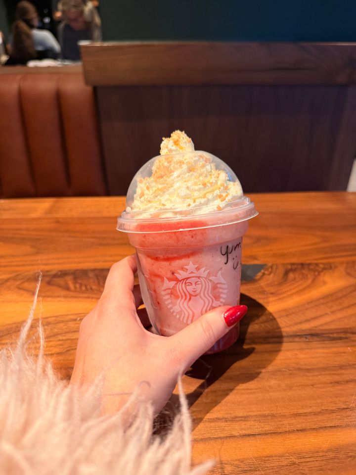 「ストロベリー ショートケーキ フラペチーノ」も、期待を裏切らない贅沢な仕上がりだ。クリームベースのフラペチーノに、ストロベリーピューレとシナモンドルチェシロップを渦巻状にミックス。その上にホイップクリームと、まるでキャンディのような味わいのキャラメルシュガーが散りばめられている。クリーミーで甘く、どこかホッとするような心地よい味わいは、2月のお気に入りリストに即座にランクインするはず。